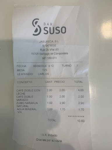 Esta tarde fun ao café Suso cunha amiga. Ela pediu un café con leite (de vaca) e eu un café con leite de soia. Ao servirnos, a camareira dixo "aquí o café con leite normal", "aquí o café con leite de soia"; cheirei o meu, bebín un groliño e comprobei que era leite de vaca. A miña amiga probou o seu e tamén era leite de vaca. Chamei á camareira e dixo "siiii, é leite magro sen lactose", eu pedira especificamente leite de soia, cando mo serviu dixo "leite de soia". Evidentemente foi unha TENTATIVA DE ENGANO, evidentemente eu non vou voltar a esa cafetaría.