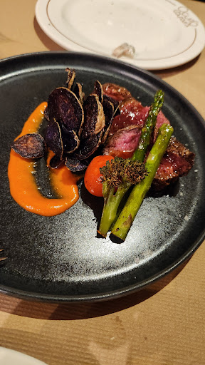 I had the prawns and they were delicious. Not sure but I think there may have been a translation hiccup in the english menu. Didn't see or taste any spring onions as per the description. Green chillies yes. But not spring onions. Steak to follow. Cooked beautifully. A glass of Galician heavy red wine chosen by the waiter which lasted well into what was (and always should be ) the highlight of any meal how ever grand or humble.