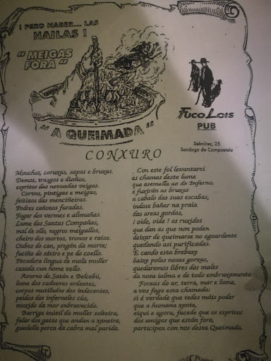 Old bar with nice music, just behind the main church. The walls were full of posters of musicians like David Bowie and Lou Reed and tickets of big concerts. We took beers and olives and they gave us chips as a welcome, all for 5 euro! It seemed like it’s run by one person who is also making the mystical ritual of The Galician Queimada. We didn’t...