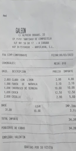 Read moreYo he ido pues varias veces, con amigos y sobrinos, es mítico de toda la vida la verdad el covid y el parón les, hizo a todos los, hosteleros mucho daño, después subieron los trimestres al triple, después, subieron los sueldos a tod@s l@s trabajadores, pero se, como bien y no es caro, los demás, locales que hay varios esa calle también sube de la plaza Roja que también hay hosteleros, yo he ido a todos la verdad el menú están muy igualados, ahora en la cantidad de comida es donde ves donde te combine y calidad y que tenga buena carta de Mariscos y Carnes a la brasa de vaca Gallega, buei y churrasco de cerdo, pulpo a la gallega, zamburiñas, calamares a la romana, etc y claramente hay un menú en todos los que hay en Santiago, pues no es caro el Galeón y tiene un poco de cada, también los fines de semana está lleno y los días festivos, El Día de Santiago de Compostela, Santo Patrono DE España, y semana Santa, etc pero tiene variado y a la, carta o si encargas también, trato bueno por dueño y personal, recomendable la, zona es muy buena y hay muchas tiendas en una calle que baja a la plaza Roja y todas de marcas buenas y Estancos, el ya tiene uno al lado, un cordial saludo y los peregrinos también van y gasta su dinero y y hay...