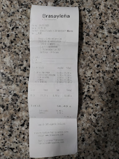 Además de la carne a la brasa, Brasayleña también ofrece una variedad de platos de acompañamiento, como patatas fritas, ensaladas y verduras asadas. También hay una pequeña carta de vinos, con una selección de vinos gallegos e internacionales.