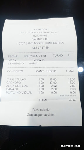 Read moreWe had dinner on a Wednesday evening, my husband ordered lamb chops and I ordered a fish fillet with a leek and seafood sauce. They told us the order came with French fries and vegetables. What we got was incredibly disappointing...the absolute worse food I have been served in Galicia. The fries where soggy and stuck together. The minimal amount of veggies all canned products (red pepper). My fish fillet came in a thick dark brown batter, fried... With something on top of the batter thick and definitely no resemblance to the sauce they promised. A sorry version of Fish and chips. Once you got rid of the batter...the fish inside was fresh. The lamb chops where also Fresh and grilled. No sauce. Service was acceptable compared to the food. The bill needed a small correction because they charged an extra item. To my mention of how disappointed I was with their food, they didn't know much what...