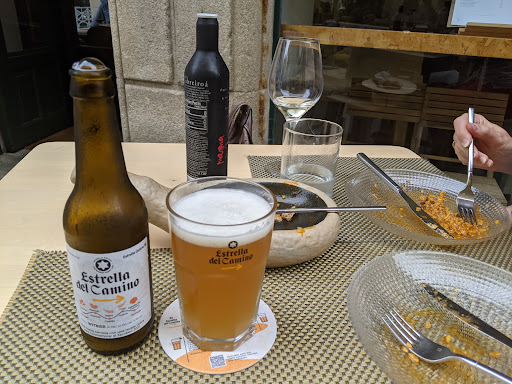 I came across this restaurant by accident, as I was looking for a quiet place away from the crowd. I didn’t have a reservation and was quite lucky that they had a table for two. It was Sunday and therefore, very busy in Santiago. The food consists of refined Galician dishes: a luscious tomato salad comprising different kinds of tomatoes and a smoked cheese foam; steamed cockles; grilled turbot on a bed of delicious vegetables; and for dessert, a coulant accompanied by lime sorbet. The dining room is quiet and lovely, beautifully decorated. A great way to get away from the crowds of Santiago and enjoy...