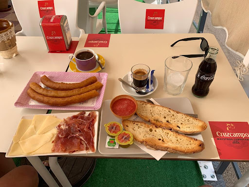 Fuimos a desayunar el día 1 y 2 de noviembre. El primer día llegamos a las 7:40 y preguntamos si tenían churros, a lo que la señora nos respondió, “sí, pero hoy no voy a hacer”. Se ve que, aún siendo viernes festivo, solo hacen churros los fines de semana. Pedimos unas tostadas con aceite tomate y jamón. Al prepararnos los platos observé que el aceite venía en tarrinas monodosis y le dije que yo prefería echarme de la botella como la mesa que ya habían servido justo antes de nosotros. La mujer nos indicó que no podía porque está prohibido servir el aceite así, y que si venía sanidad la multa es para ella. No lo terminaba de entender la verdad, porque si le preocupaba sanidad, la botella de aceite no debería haberla puesto a otros clientes tampoco… Le dijimos que no se preocupara y nos tomamos las tostadas. Muy buenas por cierto, pan y jamón estupendos.
