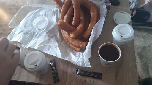 Llegué a las 8:55 y aún no estaban los churros, y cuando le decía a mi mujer que mejor nos fuéramos, justo la chica apareció con las dos raciones.