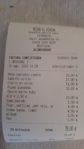 Muy mala experiencia, fuimos a comer el menú del día, de los 6 días que hemos estado por Cazorla es el día que peor hemos comido con diferencia y nos fuimos con hambre , muchísimo tiempo de espera y solo había otra mesa más, al parecer se penaliza pedir menú del día, apenas comimos, una pequeña y triste sopa aguada y mi pareja unas desaboridas judías verdes y de segundo unos trocitos de carrillada y mi pareja unos simples huevos fritos con chorizo, todo muy corriente, nada de platos de la zona y acompañado de unas pocas patatas fritas quemadas y aceitosas, el pan duro del día anterior y de postre sólo quisieron ofrecernos natillas y arroz con leche( para los que no pidieron menú hambia pan de calatrava, flan, tarta, etc..),se ha notado mucho que se penaliza pedir menú del día, con la bebida no incluida, comimos muy poco y mal por 32 € en total, algo que no nos ha pasado ningun otro día por la zona pagando igual o menos. Lamento mucho haber escogido este establecimiento en Coto Ríos, por lo que nos han comentado, estoy convencido que en el mesón Javi y Carmen o en el bar Restaurante Guadalquivir del mismo pueblo...