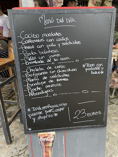 No hay carta, entras y te dicen que hay raciones y platos combinados, y la camarera "te canta" de los que se acuerda en el momento. Como dicen en otro comentario, por política de empresa. Si tienes intolerancia o problemas digestivos, te toca apandar.
