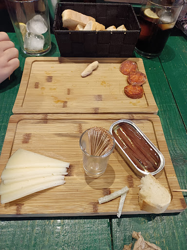The staff/owner were very friendly, we felt very welcome here. This Bar serves a lot of different kind of Anchovies (Anchoas). From lower priced ones like around 3-4 Euros for a can up to more expensive cans for 5-6 Euros. We ordered a can of "La Machina" for a bit more than 5 bucks, some Manchego cheese and some Chorizo. Two glasses of red wine with that.