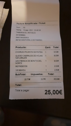 Muy mala experiencia. UNA PENA TENER QUE PEDIR EL TICKET PARA SABER QUE ME ESTÁN ESTAFANDO PIDIENDO MEDIAS RACIONES CUYOS PRECIOS NO SE REFLEJAN EN CARTA. Pido la cuenta, me dice de boquilla el camarero sin pensar mucho 25€ y noto que me ha dicho el importe que le ha dado la gana. Entonces decido pedir el ticket. El camarero de caja reclama al compañero que me dijo el importe y se ponen a cuchichear intentando cuadrar importes...muy descarado por su parte y de muy mala educación y profesionalidad. El ticket salió como salió cuando los importes de las medias raciones se los sacan de la manga al no estar reflejados en carta. Resultado, pedimos MEDIAS RACIONES de chorizo de Potes, ventresca y queso picón, 1 cerveza y mosto y nos salió 25€. Haciendo cálculos con raciones enteras y las bebidas nos hubiera salido 27,90€. 2,90 € de diferencia en total entre medias y raciones enteras....Esto sucede cuando los precios no son transparentes y no están reflejados en carta.., un engaño. Y como veis la ventresca ha costado 9 € cuando la ración completa son 8,50 € + 0,30 € de suplemento terraza...INCREIBLE PERO CIERTO. Le pido explicaciones y ¿ cómo defender un ticket indefendible??callando...verlo...