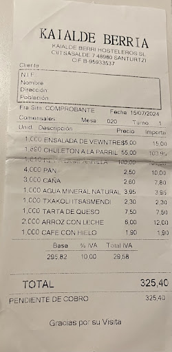 Pasamos por la puerta y entramos a comer. Nada más entrar un señor desde la barra nos dijo en un tono bastante alto que no había menú del día (un día de diario a las 14:30). Nos sacaron la carta y mi mujer y yo queríamos pescado y nuestra hija pequeña y su amigo querían chuletón. Nos llevaron a que pidiéramos el pescado más caro que tenían y que no conocíamos y el chuletón que le pusieron a mi hija y a su amigo al ver la cuenta resulta que pesaba casi 2 kgs. Se me quedó cara de tonto cuando vi la cuenta. El pescado que nos pusieron a mi mujer y a mí costaba 160 € y el chuletón de los niños más de 100 €. Después de comer, otro día, en un buen restaurante de Bermeo ( al ofrecerte el pescado y la carne te decían las piezas que tenían, lo que pesaban y el precio del kilo. Por una lubina salvaje para 2 pagamos 48 € ) me di cuenta de que en el Kai-alde Berria son unos sinvergüenzas. Lo primero por servirte un pescado para 2 y que te cobren 160 € sin que te digan nada y lo segundo por el chuletón de casi 2 kilos de los niños. Vas a comer algo después de un paseo por Santurtzi y acabas pagando más de 80 € por cabeza. Obviamente no pienso volver y si tú vas a ir, pregunta siempre el precio del pescado y el peso del mismo. A partir de ahora tendré que hacer eso siempre en cualquier restaurante que vaya, siempre y cuando el propio restaurante no te lo diga como hacen en los buenos sitios. Una...