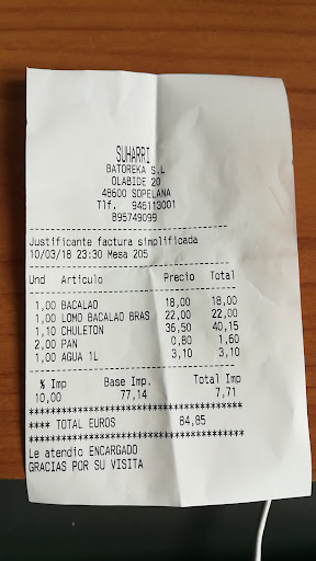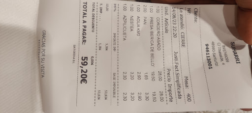 Read moreWhat a treasure this place is and MUCHAS GRACIAS A JON and ADRIAN!!!! Suharri was recommended by the hotel I was staying in because they could not provide dinner. When I arrived at 3:50 the kitchen had just closed but thanks to Jon and Adrian the kitchen provided a wonderful dinner for me, the best steak I have had for a long time. The staff were so kind and understanding and nothing was too much trouble for them. THANK YOU from the hungry English lady! I had two courses for €12.50 and a better meal than I would have had where I was staying. I will definitely return on my next visit to Santurtzi and not bother...