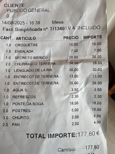 Read morePongo una estrella porque no hay menos, pedimos un entrecot entre otras cosas al punto, cuando lo traen a mesa como 2 trozos y ví que no estaba al punto, se lo comento y al llevárselo me dice el camarero que igual como el plato estaba caliente se hizo de más. Me traen otro que está completamente crudo, la sorpresa viene cuando nos traen la cuenta que nos han cobrado medio entrecot de más que dicen que me comí la primera vez. Por no olvidar las cuatro veces que vinieron a la mesa a decir que el punto de la carne estaba bien e incomodarnos la comida con mi familia haciéndonos sentir mal por la dichosa carne. Como hostelero que soy jamás hubiese actuado cobrando por un punto de la carne que se pongan como se pongan no estaba bien. El servicio deja bastante que desear, tardaron un montón para 4 mesas que había y se escuchaba como hablaban de la dichosa...
