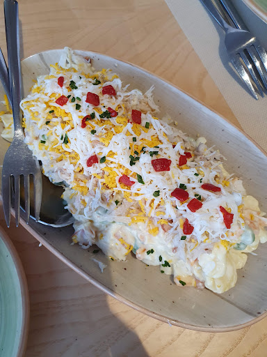 Decepción absoluta. Decidimos venir por las buenas valoraciones, tanto aquí como en otras redes sociales, al ser nuestro último día de vacaciones. Desde luego nuestra experiencia fue bastante distinta de las demás comentadas. Fue un chasco absoluto. En la mesa donde nos ubicaron pasamos un calor tremendo, no llegaba el aire (el local tiene terraza pero al reservar no me dijeron nada, no sé si por estar ya llena o por no atender correctamente). Nos quejamos pero no nos hicieron ningún caso, estando todo el restaurante vacío puesto que llegamos a primera hora. Bien nos podían haber ubicado en otra mesa más fresca. El servicio tampoco estuvo a la altura para ser un restaurante de este calibre. No nos dieron a probar el vino y nos pusieron los cubiertos desde el otro lado de la mesa, habiendo sitio desde detrás de las personas. En cuanto a la comida, sólo se salvan las croquetas, que estaban buenísimas. La ensaladilla rusa con buey de mar, no se le veía el buey por ningún sitio, y parecía de las congeladas de bolsa, insípida. Lo peor de todo y con diferencia fue el pescado. Una pieza para cuatro por la que pagamos 150 €, la hicieron a la brasa estando tiempo de más cocinándose, con lo cual el pescado estaba completamente seco. Cuando nos quejamos no nos hicieron mucho caso. Una vez más, falta de profesionalidad en el servicio. Nos la sirvieron además en una bandeja con un cuchillo y un tenedor de pescado, con lo que resultaba bastante difícil poder despedazar el pescado y más aún darle la vuelta para servir la otra parte. Me hubiera esperado que me lo sirvieran en la mesa. Por otro lado, sólo tenían una variedad a elegir, así es que no debe ser algo que trabajen mucho en el restaurante. Resumen, es un sitio al que no volvería a. Local de moda muy fashion que no se sabe gestionar correctamente, por el precio que pago espero...