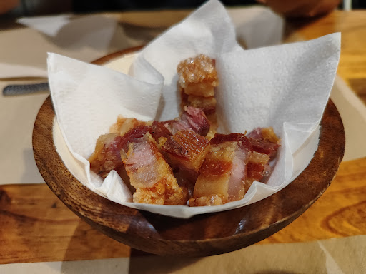 Pues era un restaurante que creía que me iba a gustar más, pero no ha sido así. El servicio correcto y no se tardó mucho en servirse los platos en mesa. Local pequeño, limpio y cuco. Los aseos también aseados. No tiene mucha variedad en lo que se refiere a primeros y segundos platos. Si tiene raciones, pero escasas, por lo menos el torrezno, que era pequeñito. Pedí el entrecot, no tenía sabor y lo que si tenía era bastante nervio, casi me salto un diente. Lo pedí con trufa (+2'5€), pero por lo menos a mí, no me supo en absoluto a trufa,ni tampoco olía a trufa. Vino con cuatro rodajas de patatas y unos pimientitos de padrón. Ya digo que las raciones no son abundantes. La hamburguesa de ternera y el secreto tampoco fueron abundantes pero estuvieron buenos de sabor. Los postres: la naranja se sirvió tal cual, sin pelar. El coulant bueno. Y como yo me empeñé en probar la trufa, pedí crema de trufa, pues tampoco note la trufa ni en sabor ni en olor. Eran unas natillas sin densidad, líquidas, con galleta. El cremaet, más bien...