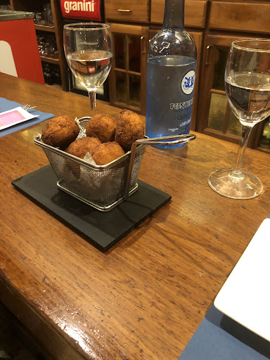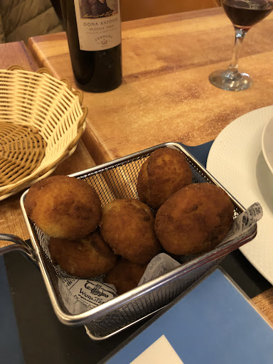 Very very friendly. Quick service. Everything served at the correct temperatures. Below are croquetas, and a chicken sandwich. The next day we got port (properly chilled), more croquetas, caldo gallego (Galician soup), and tortilla Espanola for two. Chocolate mousse and flan de cafe for dessert. Tastes home made. For the pilgrims, don’t forget to...