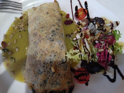 Hemos comido el menú del día. Una ensalada mixta, de primero canelones de calçots, riquísimos,y un crepe de espinacas con una salsita y frutos secos. Llevaba hasta unas bajitas de Goji, también buenísimo y muy bien presentado con un poco de ensalada de escarola. De segundo caldereta de cordero, la carne super tierna y atún a la plancha con pimientos del piquillo. El atún en su punto , delicioso, de los mejores que he comido. De postre un requesón con miel y tarta de chocolate casera con mermelada, me ha gustado porque la mermelada aligerada el sabor del chocolate.
