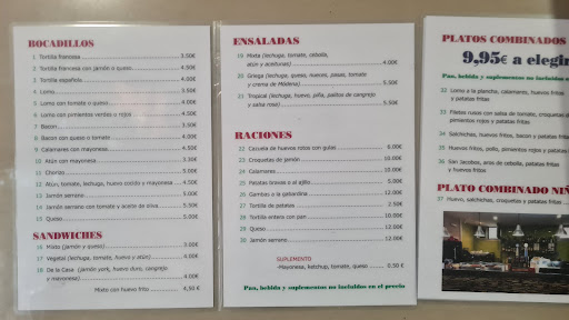 Read moreFuimos a este bar por los comentarios que indicaban en Google, y nosotros que ibamos a visitar la Ciudad nos parecía una buena opción. Tienen pinchos , tapas y platos combinados, y esta última elegímos.. La verdad los platos de pechuga rebozada no lo hicieron bien y estaba crudo indicándoselo al camarero que procedió a llevarse los platos para solucionar el problema. Los platos combinados no eran para tirar cohetes..Lo mejor el servicio, atento y agradable ..lo peor el ambiente y la sensación de no haber comido muy bien. Si me preguntan si volvería?NO y si lo...