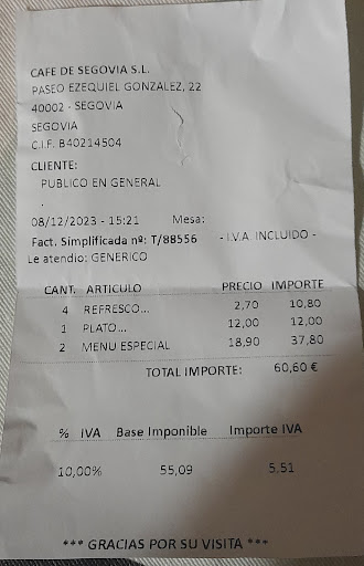 Read moreFuimos el día 9 de noviembre al menú del día,bueno elegimos varios platos distintos ya que éramos 9 personas el primero frío y de bote tanto las alubias como las lentejas y la crema de calabacín,ya de primeras alucinamos que tres veces pudiéramos que nos lo calentasen,segundo de broma ragutt cuatro trozos cortados en veinte para que pareciera algo más y lo gracioso fue pollo en salsa adjunto foto dos alitas partidas con varios sabores malísimo,me viene la camarera a preguntarnos que tal la comida y la fui sincera malísima y su reacción fue que quiero por 11,90€ pues no sé señora pero a mí 11,90 no me parece regalado como me dijo en varias ocasiones y que era una cafetería no un restaurante vale es sencillo no pongan menús del día y ya está y sino que la cocina era pequeña vamos constantes excusas para no aceptar la crítica y lo gracioso fue que en Madrid por ese precio pues señora de la cafetería cuando usted quiera la llevo a comer por Madrid por ese precio y menos y verá que si se puede comer en condiciones y en cocinas pequeñas,con todas sus excusas absurdas siento comunicarla que deja la gastronomía de Segovia por los suelos yo no sé lo recomiendo a nadie que coma un menú del día ayi ya café, bocadillos ....me callo,pero menú del día NO.pienso que muchas veces es preferible no ganar tanto dinero y perder clientela,y ganar un poco menos y ganar clientes.Un saludo y espero que lean la reseña y no se lo lleven como un ataque como la señora de ayer,si no quieren escuchar la sinceridad de los clientes mejor...