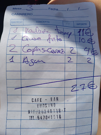 El camarero prepotente y maleducado, para empezar, pero muy sobradete tambien para que no le falte de nada... Nos han cobrado CARO , "no tenian bocatas" aunque en la carta vienen muchisimos, las raciones ponen un precio con ordenador y no especifican que son medias raciones y al lado pintado a mano otro precio mas caro, que lo sé porque lo he preguntado, y casualmente tampoco tenian de la que le he pedido... LE HE PEDIDO FACTURA Y ME HA RELLENADO A MANO UN ALBARAN COMO UN POST IT DE GRANDE, LE HE DADO MIS DATOS Y ME LA DABA SIN PONER MI DIRECCION (que no le cogía y la ha intentado poner a mano por detrás) , y cuando le he dicho que si me estaba tomando el pelo, que no HABÍA NÚMERO de FACTURA NINGUNO, me ha dicho que no suelen hacer y que si le dejaba mi email me la mandaría luego... VERGONZOSO PARA MÍ, Y MENUDO SINVERGUENZA ÉL... Le he pedido hojas de reclamaciones, que sí me la ha dado, pero NO HE QUERIDO METERLE MÁS PROBLEMAS, BASTANTE TIENE SU MADRE CON HABERLE FORMADO ASÍ... ME DUELE MUCHISIMO QUE AUN HAYA GENTE ASÍ Y POR ELLO OS CUENTO MI EXPERIENCIA, NO HAY DERECHO A QUE NADIE TRATE ASÍ AL TURISMO PERJUDICANDO A OTRAS PERSONAS AMABLES, PROFESIONALES Y SUPERSERVICIALES COMO LAS HAY.