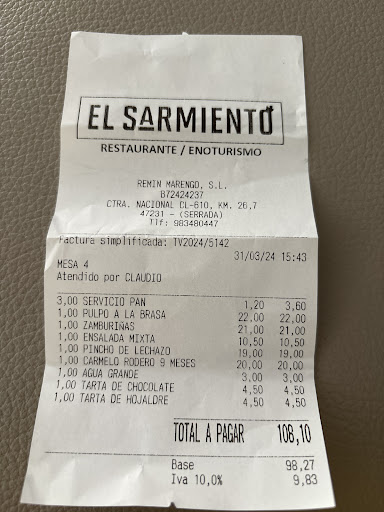 Read moreEl pulpo muy bueno, las vieiras y el pincho de lechazo le faltaba sabor, el postre de hojaldre que yo pedí porque es típico de Serrada no era reciente estaba blando..aún así se podria ir a probar otros platos que tenían buena pinta si no fuese por la camarera, una persona que no sabe estar de cara al público, una vergüenza la contestación y la manera de decir las cosas cuando pedimos dos postres y le pedí por favor tres cucharas para que comiese mi peque también…no le conteste por no rebajarme a su altura y porque soy educada…además de que la pedimos un vino joven y nos trajo el crianza(que lo tomamos porque nos gusta el vino y nos daba igual la demasía de precio).Por personas como ella han perdido unos muy buenos clientes ya que era la primera vez que íbamos y no volveremos, si está amargada o no quiere trabajar que se quede en casa que hay personas que estarían encantadas de hacerlo…Decir también que los dos hombres tanto como el que te llevaba al “salón” como el camarero muy educados y amables , el sitio muy bonito y cuidado. He sido camarera durante 20 años y personas como esa camarera hacen mucho daño a los...