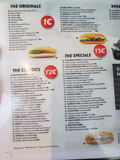 Read moreThey didn't give us one small piece of beautiful, innocent sandwich. I think that four big guys took our piece and got away with it. Luckily our guy finally got his good dish but that was becuase of the hero we met that translated everything we said in english to spanish. The other big disadvantage was that numbers 66 and 91 that I took were made without any souse. Overall I think that I would recomend 100 montedados to my family, friends, neighbours and enemies. Everything was 1 euro because of wednesday, otherwise it would be a big L. On the way to the exit we saw a big fat rat smashed by a car on the road and that is why a have to lower my rating a little bit....