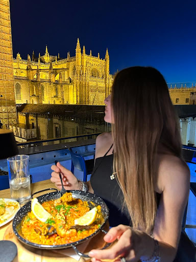 As for the restaurant itself, the panoramic views of Seville's Cathedral from the rooftop were breathtaking. The ambiance was romantic, with the cathedral illuminated against the night sky, creating a truly magical atmosphere. The menu was fantastic, we got many things but the best plate was of course the see food paella. The warm chocolate cake also was served alongside generous scoop of velvety vanilla ice cream. The presentation was as great as the taste.
