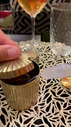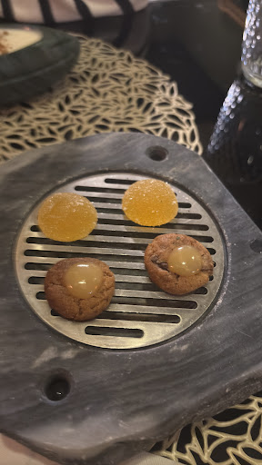 Course 8: dessert. A potted mint plant, but in banana pudding, banana ice cream, and cookie crumble. Iâve seen similar things frequently so this was less exciting. Along with it was Az-zaits take on a ferrero rocher, served with chocolate covered granola in a literal rock. Not sure what the rock does but it was cool.