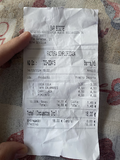 Read moreESTAFADORES . Para empezar, cuando hemos pedido la carta nos han traído dos papeles (sucios y arrugados) con algunos platos escritos. Y sin precio alguno. Cuando hemos pedido la cuenta, una camarera (rubia) ha hecho la cuenta en su cabeza y en menos de 3 Segundos nos ha dicho un precio al azar. “Son 19€” y directamente nos pone el datáfono en la mesa para tener que pagar. Al ver que es demasiado dinero para: 1 cocacola, 1 cerveza, 1 tapa carrillada, 1 tapa de choco( 3 minichocos) y 1 tapa de pimientos asados, le he pedido el ticket. Se ha ido para la caja registradora y se ha puesto a preguntar qué habíamos pedido porque NO LO SABÍA. Y aún así nos había hecho la cuenta en su cabeza. Se ha llevado 5 min modificando los precios para que llegara al total que nos había dicho. Al ver que no podía, ha dejado la cuenta en 16€, 3 EUROS MENOS QUE NOS HABÍA DICHO DE PRIMERAS. (3€ que se hubiesen ido para su bolsillo si nos hubiésemos quedado calladas) Al ver la cuenta, nos ha puesto a 4,5€ CADA TAPA (CADA MINÚSCULA TAPA).