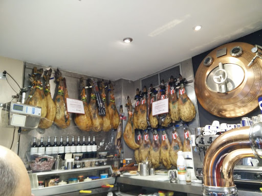 Es un sitio con aroma a tradición y toques modernistas. Bien cuidado, con sus jamoncitos colgando y una barra metalizada. ¡Qué mítico, joé! Tiene una gran terraza exterior muy agradable en días en los que el calor aprieta pero no ahoga. En su interior hay varias mesas, aunque yo soy muy de desayunar en barra.
