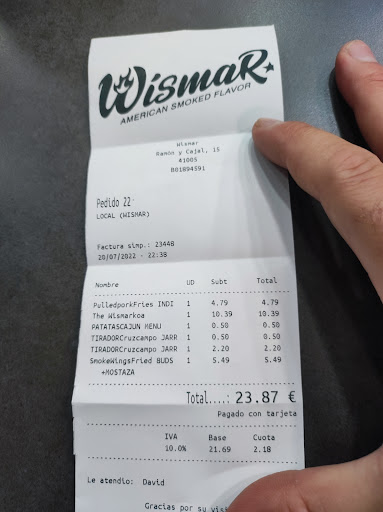 En definitiva, Wismar no es un simple fast food, como he mencionado anteriormente, es mas parecido a una experiencia gastronómica dentro de unos límites lógicos. Es lo que promete ser. Es muchisimo mejor que otras cadenas de franquicia que no tienen cabida en esta reseña.Sevilla nos brinda bastante fast foods "reconocidos" y de una buena calidad también, pero yo sin duda me quedo y me quedaré con Wismar. Desde aquí invito a probar sus productos para que puedan compartir también su opinión. Muchas gracias por llegar hasta aquí y por su atención. Nos vemos en el "Templo" o mejor dicho en Wismar.