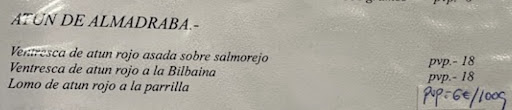 Comimos en la zona 'restaurante' (el establecimiento tiene otra zona 'bar de tapas'). Esta zona 'restaurante' es muy ruidosa. Pedimos "atún a la bilbaína", que es un plato que viene en la carta con un precio de 18€ (ver "ventresca de atún rojo a la bilbaína" en la imagen adjunta). Nos sirvieron un plato de atún a bilbaína con una cantidad considerable de pescado. Una cantidad tal que no pudimos terminar el plato. Pensamos: ¡menuda ración generosa! Al traer la cuenta, vemos que nos cobran 33€ por el atún. Dejo aquí parte de la conversación posterior con el camarero, tal y como la recuerdo.