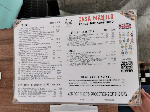 My partner and I are from Hong Kong🇭🇰 we visited Casa Manolo in September without any research. The wide range of choices made me delighted as a tapas lover! We ordered 5 tapas and few cold beers after a long walk, which was a great rest in the busy plaza! I love their fried seafood and my partner love their meat dishes, nothing fancy but traditional and delicious.
