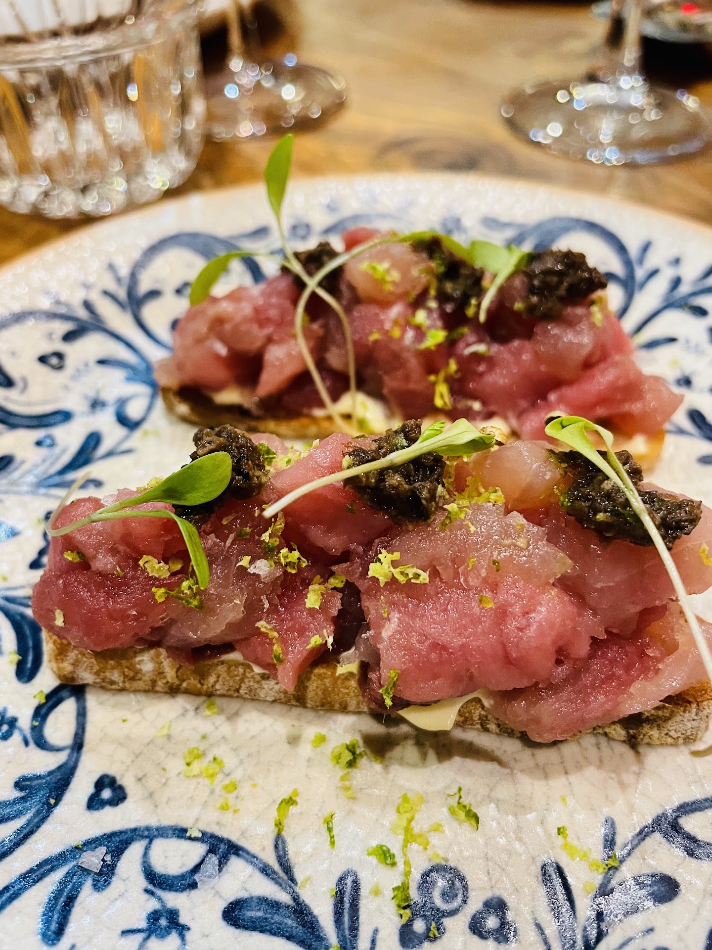 Now for the bad. The food was overpriced, not tasty and the portions were too small. We opted to take the tuna tartar which was praised in other reviews and, decided to combine it with sea food tapas and white wine. The waiter convinced us to also get a fish cooked in the oven with wine. After a while, she came back to inform us that the tuna tartar was not available (even though we saw them serve it to another table later) and suggested the salmon tartar (two pieces). Eventually we had the salmon tartar, the mixed croquettes, the (one) scallop and the fish. The fish tasted like the sea, but not in a good way. It was clearly undercooked and there was no real spice or herb involved. The salmon tartar was tiny, nothing special in taste, and quite expensive! The scallop was not really cooked but, admittedly, the combination of jamon pieces, meat sauce, and peas was very good. However, again, one scallop! Finally, the croquettes were very good (but not the best we have had). It is possible that we would not have had such a bad experience if we opted for more simple dishes (like the croquettes) but this is only hypothetical and I would bet against it.