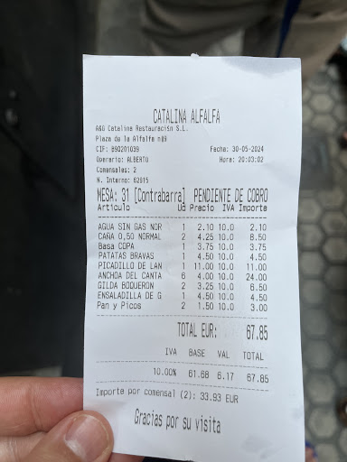 We had a pleasant experience at Catalina La Barra! The atmosphere inside is super cute and stylishâperfect for grabbing a drink to start the evening. My sister and I both ordered Tinto de Verano, which was refreshing, but we were surprised to be charged âŹ3.50 for one and âŹ8 for the other, even though they were the exact same drink. A bit odd and definitely worth double-checking your bill.