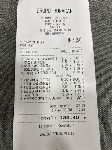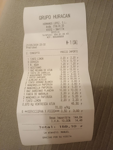 Read moreBuenos días . Llevo comiendo siempre en vuestros restaurantes que , sin duda , son de las mejores cadenas que hay en España. Que a parte de la comida que es muy buena , se conocen por su amabilidad y el buen servicio que siempre suelen atendernos bien . Nunca antes había probado en la cervecería Huracán de Bermejales . Pero resulta que el pasado sábado día 13 de abril, me fui con mi mujer y me hijo para almorzar ahí . Llegue tarde , a las 16h15 . Ponían que terminaban a las 16h30 . Todo esto lo entiendo. Lo que pasa que hemos llegado , nos hemos sentado y pasando 3 minutos viene un camarero con una coleta y me dice de una mala manera ( hemos terminado ya , ya no servimos) le dije que ( tranquilo nos vamos sin ningún problema, no pasa nada ) . Lo que no me gusto es la manera , fue en voz alta y no con educación como suelen atendernos en los otros restaurantes. Parecía que he venido para pedir comer gratis, como si me va a hacer falta un favor. Hay maneras de hablar que dejan las 2 partes satisfechas pero levantando la voz así me parece lamentable. Por culpa de un comportamiento así daña la imágen de grupo Huracán ....