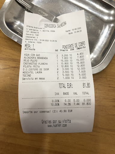 Read moreSablazo. Cuando se realiza una reseña, al parecer la mayoría de las personas omiten la variable "relación calidad-precio". Puede ser un sitio bueno si eres de esas personas que le sobra la viruta y no te importa que te metan con la Katana forjada por Hattori Hanzo y recién afilada, no sabes el número de dígitos que tiene tu cuenta corriente o si piensas que es absolutamente normal que te peguen un sablazo por servirte pescado fresco, como si viniese de Madacascar y no de la lonja de Huelva que está a una hora. La comida tiene buena calidad.... sin más. Unos chocos frescos, unas acedías... que al parecer ahora deben de estar en peligro de extinción por el precio, cuando están en todas las pescaderías sevillanas. Una ensaladilla y unas almejas de carril muy buenas..., lástima que cupiéramos a menos de 1 almeja por comensal. Afortunadamente pedimos pan como si estuvieramos en Polvillo para mojar en la salsita y apaciguar el hambre. La paella fue una infamia a precio de caviar de esturión ruso. No pedimos nada de carne, ningún pescado para compartir, ni botella de vino..., sólo unas cañas. Por los 50 euros por barba que pagamos creo que hay muchísimos sitios mejores donde te ponen mejor calidad a mitad de precio. Incluso tienes para gasofa e irte a Huleva y ponerte como María Jiménez, que Dios la tenga en su gloria, de pescado y mariscos y en mejores emplazamientos, y no en un callejón donde viven los sobrinos de drácula. Todo esto me hace pensar en el cambio de idiosincrasia sevillana. ¿A dónde ha ido el buen tapeo de calidad a buen precio en Sevilla? Está claro que en el centro ya no. Si la gente se sorprende por que le pongan ¡pescado fresco!, ojo. ¿Sabéis que vivimos en un país costero- pesquero? un plato de ensaladilla de gambas, unos chocos fritos, unas acedías y unas almejas..., y lo ven como una cocina excepcional.... es que a lo mejor vienen de Minessota. Creo sinceramente que es más para guiris que vienen a pagar lo que les pidas. Como parada para tomarte una cerveza y pedirte una tapa....puede estar bien dejarte 20€ por cabeza, aunque luego llegues a casa y remates con una frutita o un sandwich mixto si eres de comer, pero para un almuerzo a cuerpo de rey... ve preparando...