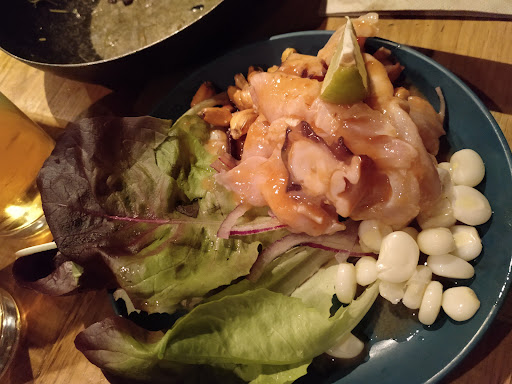 This place was highly recommended to us by our AirBnB host, so we decided to check it out. This place is a Asian fusion restaurant and the prices are fairly priced in my opinion. The restaurant looks small when you enter, but there is another floor upstairs. It had a cute interior. Not too much going on, but very fitting for this environment. This place was quite busy at 1400, but luckily we got seated right away. First we ordered drinks and that was definitely my favorite thing. We ordered the diablito?, which consisted of tequila and other various mixes. It was perfect! It was very freshing and the tequila flavor popped, but was not overbearing. We ordered the chicken panko salad, which had good flavors and spices, but a little too much dressing for the amount of salad you got. The chicken appeared to be cooked too long by the color of it and it was, but it had decent flavor. Secondly we ordered two different ceviche dishes. One had just fish and calamari and the other was fish and octopus. Both ceviches were fresh, but a lot different than what I was expecting. Usually when I eat ceviche it is coated lightly with lemon or lime juice, but this ceviche was tossed in mayo or some kind of sauce. I thought the sauce they tossed it in was too much. We wanted to eat something light for lunch, but felt like we ate something very filling. We tried the yuca fries and they were fine, nothing exciting. It was bland and so was the dipping sauce that came with it. Lastly, we had ordered the wok soba. It was cooked nicely in the wok and had vegetables you would typically get in an Asian noodle dish. The vegetables were not soggy and had a nice crispy texture to it. The chicken was cooked nicely and was not over cooked. It was quite tender. Unfortunately, we all thought the dish was too salty. Overall, I thought this place was cute and would definitely be a place to go have a drink or two, but the food was just fair. It definitely had the flavors though, but it just was not for our party. The service was great although there was a language barrier (expected on going to a foreign country). We did order a dish and it never came, but that is ok because we had enough to eat. It was a busy place and we were...