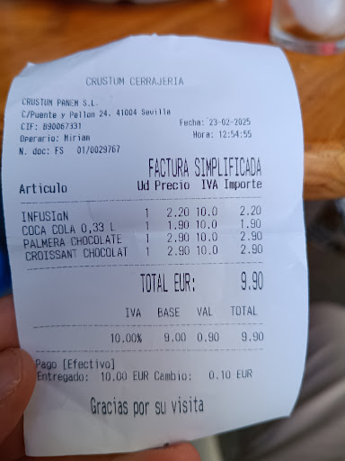 Read moreOh my god peoples, do not walk past Crustum! Wonderful empanadas! :-) Despite the member of staff's limited English, not to mention my equally limited Spanish, she explained all the different flavours. I left with tuna and a broccoli & blue cheese. Tasted sensational, both of them! They were priced at 2.30 euro which was a bit more than a couple of other places I tried but, completely worth it! Not...