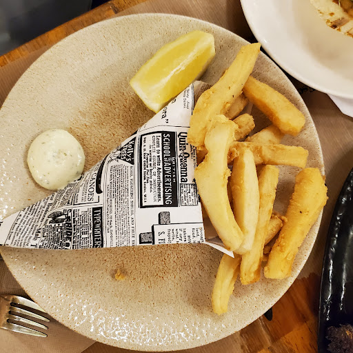 The restaurant is coffee shop like, less restaurant style; one large glass walled room, no table cloths or booths- small dessert counter. Serve was friendly and helpful. English spoken here. The cuddle fish was a served in a cardboard sleeve on a plate with a dab of sauce and lemon. The cuddle fish was smooth and a firm just how I like it. Probably about 10-12 "sticks". The sea bass (branzino) was butterflied and grilled, served with salad and lemon wedge. It had a nice crust but was a little over cooked as it was on the dry side. Perhaps just my preference of having fish on the rare side. I didn't eat the salad that came with the dish. The Moroccan spiced chicken was really good; 2 pieces of moist boneless thighs spiced and sauced. Very flavorful. Definitely order this one. The scallops were colorfully presented. They were fresh ~2cm each served with scalloped potatoes (more like mashed), some kind of roe, and sprigs of something - a delightful sight served on a half shell on top of a leaf of lettuce. Scallops were done perfectly, and tasted like scallops. Dessert was the Dona Encarna cake. A multi layer cake with a light caramel sauce and a variety of nuts. This makes each bite of the cake customizable to taste and texture. It was sweet but not overly sweet for my taste. I'd order again. In summary, it was a good dinner in a pinch as I was looking for ox tail but couldn't find it and it was getting late for dinner, even by...