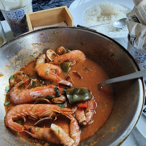 Restaurante muy recomendable de comida portuguesa. Servicio de 10. Hemos pedido para dos: unas gambas al ajillo portuguesas, que tiene el aceitito ligeramente diferente a las gambas al ajillo españolas, pero muy rico también; y cataplana de mariscos, con langostinos, gambas, almejas, patas rusas y buey de mar, increíble de buena. A tener en cuenta que las cataplanas y los arroces tardan 40 min en cocinarse, pero merece muchísimo la pena la espera. La pena es que hemos venido el día de antes del cambio de carta de cara al verano, y no había algunas cosas, pero me ha dado igual, he comido igual de bien como podéis ver en la foto. Recomiendo venir en día entre semana, porque teníamos el salón para...