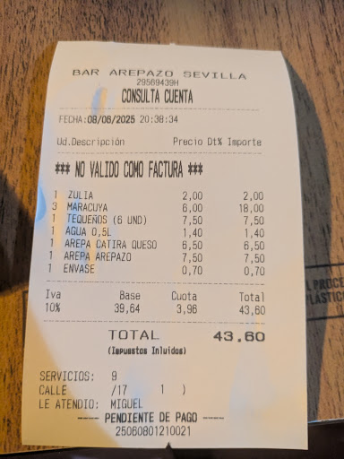 Read moreWow what a bad service and food, I was so excited to have Venezuelan food in Spain. When my full party arrived the service became very slow to the point, they kept forgetting things that we ordered. Each time they did bring out the food they would leave the empty plates and glasses on the table. When it came to paying the bill we called 2 waiters but they didn't come and only when half of us were leaving the other 2 were waiting for a take away box and to pay is when they came. It's very disappointing because I've had better Venezuelan in south London than here. I was expecting good service and food but that was a let down. Good customer service and delicious food goes hand in hand. They missed the memo...