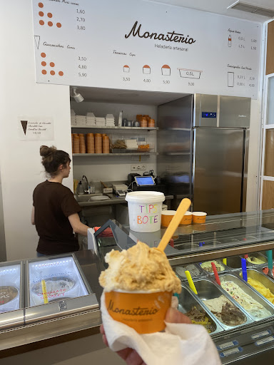 Read moreWe are in Seville for a week and always refer to Tripadvisor for ideas. El Monasterio Heladería Artesana caught our eye after an evening in town. We were served by Miriam - probably the friendliest assistant we have ever met (with smiling eyes too!). But what of the ice cream? An amazing choice! I had a cone with 2 scoops: vanilla with mango on top. So tasty and fresh. My partner had lemon meringue pie and cheese with figs ice creams - gorgeous! We were served very promptly too. The price was very reasonable, and it is handily placed amongst restaurants and on the edge of the old town. We enjoyed it so much we will go (and probably again!). We can thoroughly commend El Monasterio Heladería Artesana ice cream...