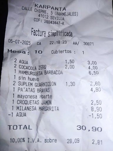Paseando me pare para tomar algo con mi pareja, pedimos unos nachos, una pizza, 4 cervezas y dos tinto de verano, des pues de reclamar tres veces la bebida solo nos llegó las 4 cervezas y 1 tinto de verano, a la hora de pagar le comentamos al camarero que de los dos tintos solo nos llegó uno, la sorpresa fue cundo nos devulven el dinero diciendo con muy mala educación que el tinto de verano lo habian puesto y que había que pagarlo, al negarme y decirle que no iba a pagar algo que no me habían puesto, me dicem que van a llamar a la policía! y después de ponerme en evidencia delante del resto de clientes, le pido la hoja de reclamaciones y pago la cuenta con el tinto que nunca nos pusieron, la relleno y en ese momento la camarera que me trató como si fuera un delincuente y estuviera robando, empieza a hablarme con educación, entonces decido romper la hoja de reclamaciones, soy vecino de los Bermejales y no vuelvo al Karpanta nunca más, miren la educación y el trato de...