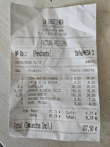 Read moreWe were looking forward to dining here given reviews but were so disappointed withe the outrageous prices of their seafood! They didn’t have any seafood items available other than those sold by the weight. We have traveled 1 month in Andalusia and this has been the most expensive place we’ve been to (double the price of the fine dining restaurants!). Our bill was over 90 Euros for 6 pieces of steamed shrimps (5 Euros each!) , 4 crayfish, 2 small conch, 4 canas of beer and a very good 4 Euro tapa of ham. We’ve been to Michelin rated restaurants that served an oyster of 3 Euros but they did more than...