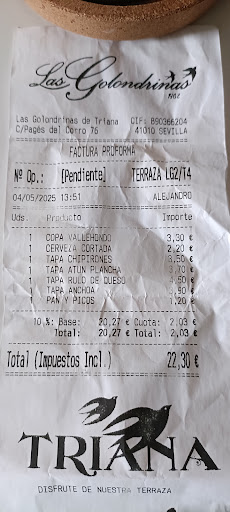 Read moreMy husband and I went to Las Golondrinas after seeing the restaurant featured on a YouTube channel with rave reviews so we decided to give it a try. We ordered a total of five tapas. 1. Rabo de Toro (oxtail stew) - tender meat, little salty, 4/5 stars 2. Champinon (grilled mushrooms) - great grilled mushrooms with sauce, 5/5 stars 3. Punta de solomillo (pork grilled tenderloin) 3/5 stars - meat was okay, not that tender, little dry, 3/5 stars 4. Pinchito de cerdo (pork meat spiced skewer) - tender meat, nicely seasoned, 4/5 stars 5. Pinchito de Cordero (lamb skewer) 3/5 stars. The food was decent, but it wasn’t the best tapas we have had in Seville. They have limited outdoor seating. Overall, the service was slow and not...