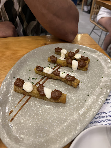 Read moreTerraza muy amplia con gente esperando fuera para sentarse con lo cual piensas que va a ser una experiencia increíble, pasamos a sala e igual de lleno, se ve que el local tiene mucho éxito, hasta ahí todo perfecto. Tardaron más de 10 min en tomarnos la bebida porque en sala un solo camarero no daba abasto el pobre con tantas mesas mientras su compañero hablaba en la puerta con una conocida, por fin deciden ponernos la bebida el chico muy simpático nos atiende y toma nota todo lo rápido que puede, demasiadas mesas para tan poco personal en sala. Empieza la desilusión, pedimos el hojaldre de bravas (6€) esperas mínimo que sea un picoteo, 4 bastones de patatas con 4 gotas de salsa en lo alto, nos quedamos mirando y decimos bueno habremos elegido mal, pedimos las tostas de atún, la calidad muy buena, el atún espectacular, por 5,50 merece bastante la pena. Seguimos con el variado de atunes… otra desilusión más, 6 taquitos de arroz frito con una cantidad tan ínfima de atún encima que parecía de risa (no hicimos fotos por vergüenza ya) estaba bueno pero por 14,50 me pareció que ya era una cámara oculta, la cerveza en copa no conseguía estar del todo fría, lo comenta la mesa de al lado y coincidimos en el pensamiento, el otro camarero dice que está bien, le enfría el vaso y le trae otra… sigue sin estar fría la cerveza… 22:35 nos dicen que se han quedado sin copas de cerveza, que esperemos que vayan al bar de al lado a pedir más. Pedimos el plato de pluma ( bastante pasada por favor, añado) por 15€ nos ponen una cantidad que parece más bien una tapa, no comentamos el punto de la carne ( venía al punto) porque ya dábamos por nefasta la experiencia, pedimos la cuenta y se acerca el camarero a ofrecernos unos chupitos de parte de la casa, no tiene la obligación pero se le agradece el detalle, nos mira como pidiendo disculpas por tardar, todo lo contrario, nosotros agradecidos por todo lo que corrió para intentar atendernos rápido. Nos tomamos los chupitos entre risas quitándole hierro al asunto comentando que después de una cuenta de dos personas de 75 euros, no sería mala idea pasarnos por cierta cadena de comida rápida por unas hamburguesas. 3,20 de pan y picos (1,60 por comensal) que eran dos bolsas de picos y un cuscurro de pan más pequeño aún que los bastones de patatas. En fin, espero que la experiencia esa noche solo fuera así de nefasta para nosotros, dudo mucho...