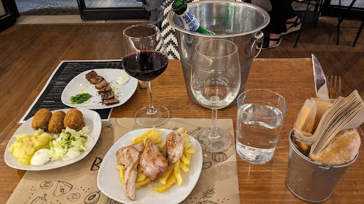 Optamos por pedir platos al centro, algunas tapas también y apartarnos para así poder probar más cosas. Nuestra elección: gyozas en salsa de curry, estaba fuera de carta y debería ser un fijo de esta. Espectacular. Textura y sabor. Hay que probarlas si o si. ensaladilla, correcta. risotto de boletus, espárragos trigueros, trufa y parmesano. Un espectáculo para el paladar, sabores notables e intensos, cremosidad adecuada. Muy recomendable. revuelto de patatas, huevos, morcilla de Burgos y cebolla caramelizada. Si, plato pesado pero sin duda es un top del lugar. Pedimos dos de lo que nos gustó. A pesar de ser plato con alto contenido en grasa su elaboración no añade más pesadez al mismo, cocinado correcto y nada aceitoso. Sin duda, muy recomendable. revuelto bacalao dorado, nada destacable. Si lo omites no te pierdes nada. pluma ibérica (tapa), sabrosa y tierna. Correcta, sin mas. carrilleras al vino tinto (tapa), otro top sin duda de este lugar. Textura increíble, muy limpia, tierna y sabrosa, se deshace en boca. Sabores intensos y ricos. Marcharse sin probar este plato no tiene perdón. Altamente recomendable. espinacas con garbanzos (tapa), plato tradicional, sencillo y su vez arriesgado por la amplia posibilidad de comparación que tiene. Decir que están muy buenas, consistentes y bien aderezadas pero sin pasar límite de estropear plato. Las pediría nuevamente. tiras de lagartito iberico, correcto sin más. berenjenas rebozadas con queso de cabra y miel de caña. Aceptables, el rebozado algo mejorable y el queso insuficiente, algo ridiculo. O menos berenjenas o más queso que sería lo acertado. No obstante tienen el aprobado. coulant de chocolate y helado vainilla. Nada destacable, no parecía casero. panqueque relleno de dulce de leche, espectacular. Nos informaron que era casero y nuestro paladar lo confirmó. Estaba fuera de carta y hay que probarlo sin duda.