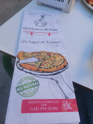 Read moreLlevo pidiendo en este sitio y comiendo allí en su terraza desde hace años, pero hasta hoy no puse reseña, y es porque quiero agradecer desde el primer día que pisé este lugar, la amabilidad, atención y profesionalidad de la plantilla de la Trianera de Pepe, (desde Fede hasta todo el personal) además de que tienen una comida exquisita y abundante porque por ejemplo las pizzas están súper bien cargadas de ingredientes y las patatas todas están repletas de condimentos. Por último, es un sitio que tiene muchísima limpieza, que para mí es un punto importante a tener en cuenta. Por lo que, si tienen una comida magnífica, la atención y trato es inmejorable y el sitio tiene limpieza y tiene un encanto especial de paz y te tratan con mucha cercanía y familiaridad, es fácil decir que La Trianera de Pepe es mi lugar favorito tanto para comer allí como pedir a domicilio. ¡Gracias por todo Fede y familia, sobretodo por atendernos...