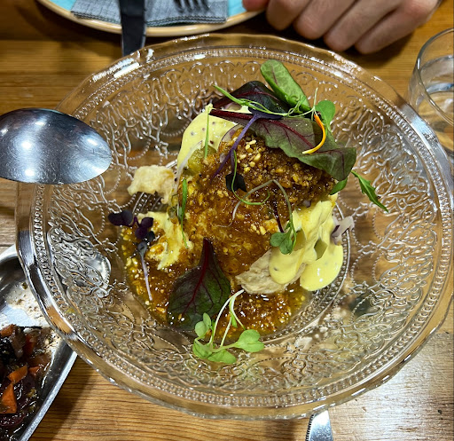 We had the chicken salad, candied artichoke, mellow rice and mango custard/raspberry desert. The chicken salad tasted very soft and yet so many different flavors in one dish that go so well together. We loved it! The mellow rice was much stronger of taste with a light pesto topping it was really what filled us up, but our favourite was the artichoke! Iâve never had artichoke like this, both sweet, salty and acidic. It was really really good :) and then the raspberry was super foamy and the custard was very light. Both not too sweet or heavy. Delicious đ