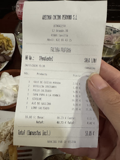 Read moreFuimos a comer mi amiga mi pareja y yo con intención de probar algo diferente Nos pedimos un piqueo para compartir un ceviche solo y también chicharrón de cerdo El piqueo nos pareció demasiado caro para la cantidad que traía 16€ lo único que nos gustó de ese plato fue el anticucho Al comer el ceviche me gusto bastante lo único que se habían pasado de ponerle picante 🌶️ ya que de tanto que llevaba me sentó un poco mal y sinceramente lo pase un poco mal Se lo comenté a la camarera y no vi intención de que me lo cambiara a lo que me contesto que tendría que haberlo pedido sin picante siendo que ella no nos lo comento en ningún momento y en la carta tampoco lo informan al final le pedi que me quitara algo de picante ya que no me dio ninguna solución me dijo que sin problema Cuando me trajo el plato me dijo q ue lo que picaba era el líquido con lo cual me trajo solo el pescado sinceramente no me pareció lo correcto he sido camarera y no me pareció la mejor solución debería haberme...